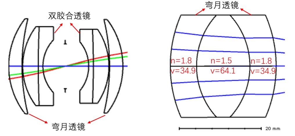 图3. 常见双高斯物镜结构(左)及Steiheil架构三胶合透镜(右)