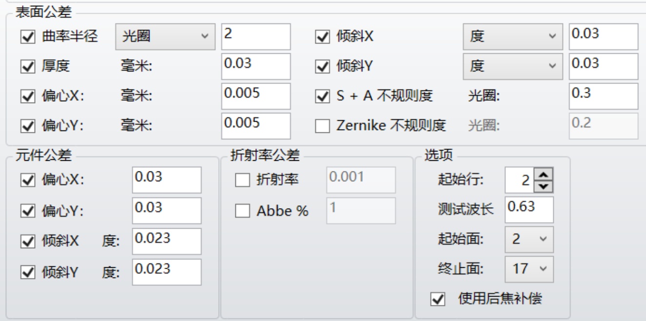 加工误差方面,选取镜片中心厚度偏差、元件偏心与元件倾斜作为核心误差源,误差限值依据中等精度光学加工的行业规范设定(厚度偏差±0.1 mm,偏心量 ≤ 0.05 mm,倾斜角 ≤