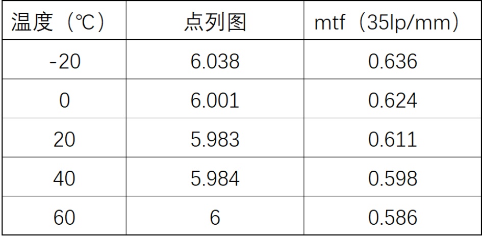针对胶合透镜的温度敏感性问题,进一步引入温度变化的耦合影响进行联合仿真。胶合透镜中光学镜片与胶层的热膨胀系数存在差异,温度波动会引发胶层应力释放及镜片面形的微小畸变,进而影响系统成像性能。本研究选取典型工作温度区间(−20℃~60℃),借助Zemax内置热分析模块,调用光学镜片与胶合层材料的热膨胀系数(CTE)等热学参数,自动求解温度载荷下的镜片几何变形、面形畸变及元件空间位置偏移,并将上述热致偏差直接耦合至Monte Carlo公差分析模型中开展联合仿真。结果表明,在该温度范围内,系统MTF指标未出现显著衰减,达标良率仍维持在98%左右,验证了胶合透镜在温度波动环境下的结构稳定性与成像一致性。具体数据如下图13所示。