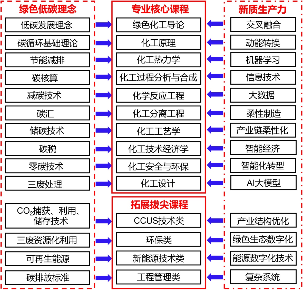 在“双碳”、“新质生产力”等大背景下,绿色工程素养已成为未来化工工程师必备的重要素质之一。为了培养具备绿色工程技能的工程师,构建一个完整的绿色化工课程体系至关重要[11]。这个体系应该贯穿绿色经济、绿色环境发展、绿色政治生态、绿色文化发展、绿色社会发展等理念,包括“低碳发展理念”、“碳循环基本理论”、“节能减排”、“交叉融合”、“动能转换”、“机器学习”等绿色低碳和新质生产力的理论和技术,将这些理论知识有机融入理论课程教学,更新绿色化工理论课程体系,确保学生在学习过程中能够全面理解并应用这些概念,为学生打好扎实的低碳和创新理论基础。图1是将绿色低碳理念和新质生产力融入专业核心课程和拓展拔尖课程的简要示意图。