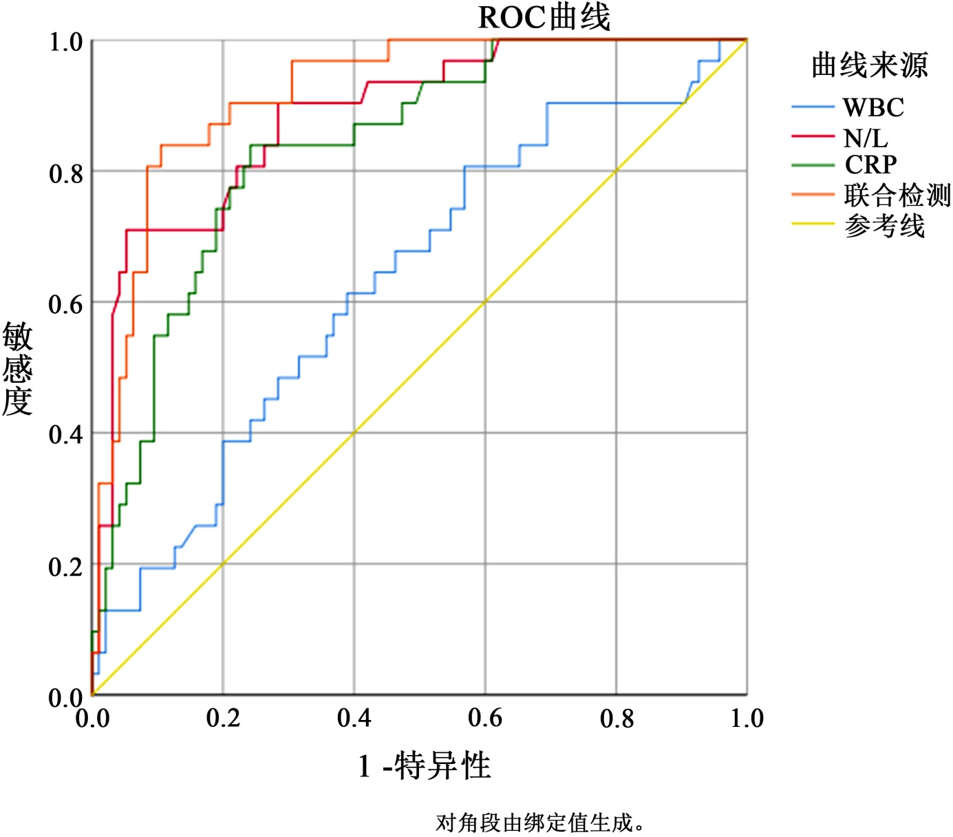 对外周血WBC、NLR和CRP水平分别及联合诊断做ROC曲线分析,三者联合诊断因子预测MPP患儿病情程度的敏感性高于上述单一指标检测,差异具有统计学意义(P < 0.05)。见表3、图1。