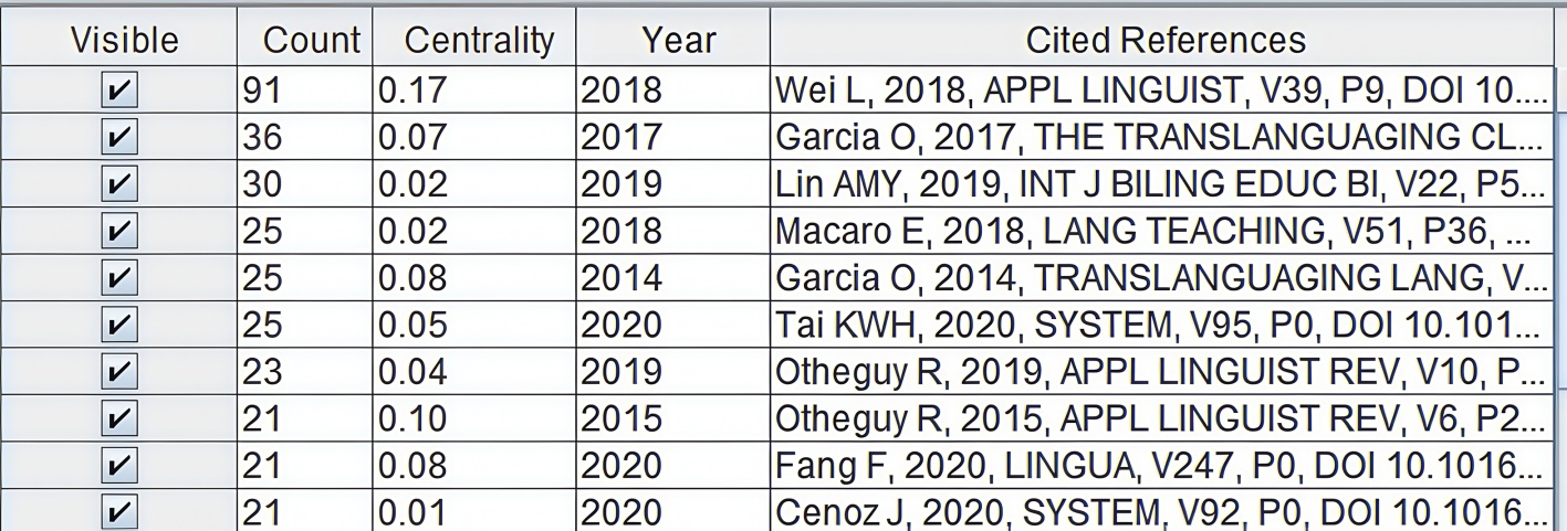 由图可知,被引频次前10名的文献中Li Wei及其合作学者的文章共2篇,García及合作学者的专著或期刊共2个,其中最高被引文献为中国学者李嵬于2018年发表的文章“Translanguaging as a Practical Theory of Language”。该研究概述“超语”视角下的语言实践理论及“语言与认知论”及“心智模块论”两大问题,讨论“超语”与多模态的关系及“超语空间”和“超语本能”等概念。其他高被引文献还从语言多样性视角出发,考察少数族裔语言的“超语”实践,如Otheguy等人[27]在区分“超语”“语码转换”“命名语言”等关键概念的基础上指出“超语”教学对打破单语局面、振兴多语发展有重要意义;由此,学界目光除聚焦“超语”教育学理论与实践应用外,还关注“超语”经验构建与多语发展、身份认同的关系。