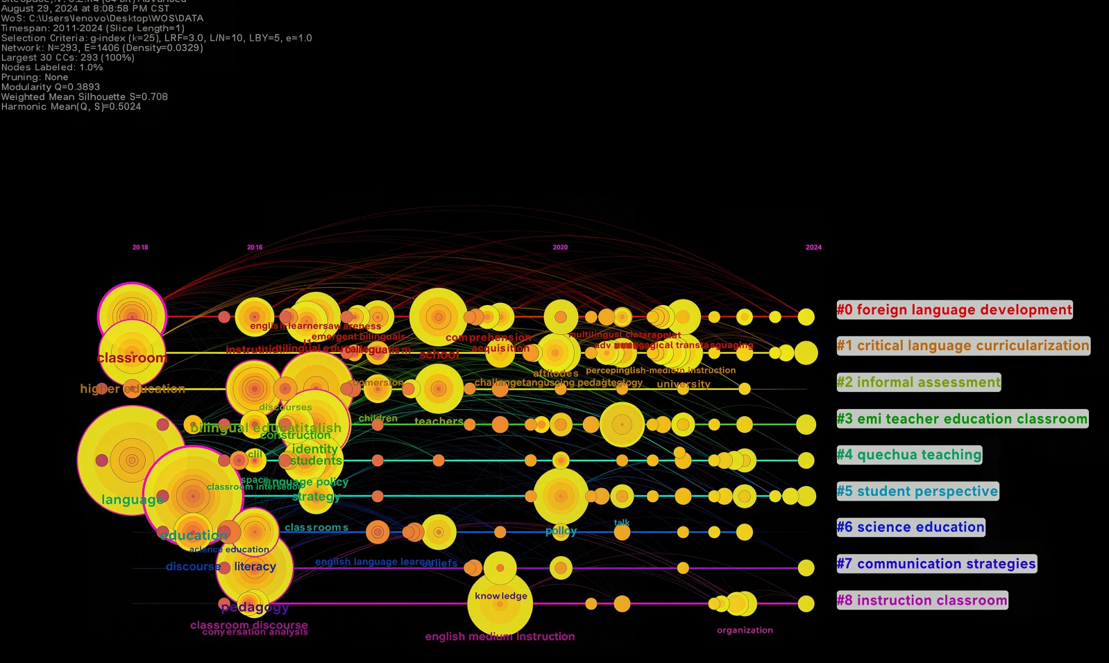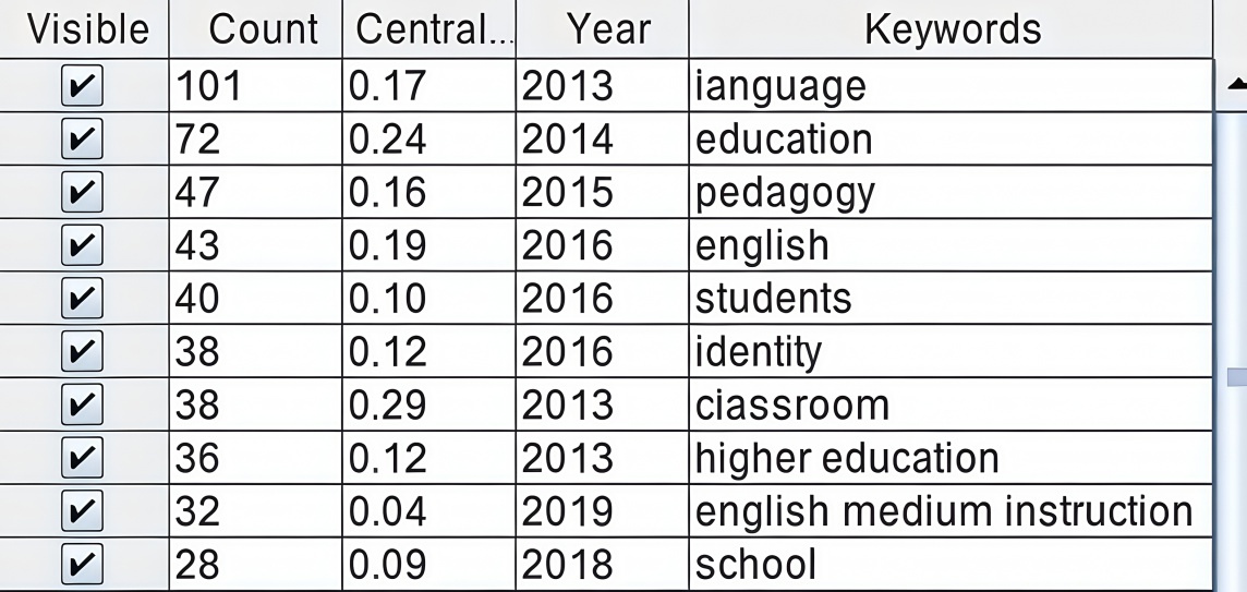 这些关键词的聚类表明,在相关文献中,教育和语言学习是主要的研究领域,这也与本研究的切入点相符合,即课堂情境下的超语研究,其中大多数研究主要聚焦于课堂中的教学方法和策略。此外,对特定语言(如Quechua)的教学和非正式评估方法也是研究的一部分。