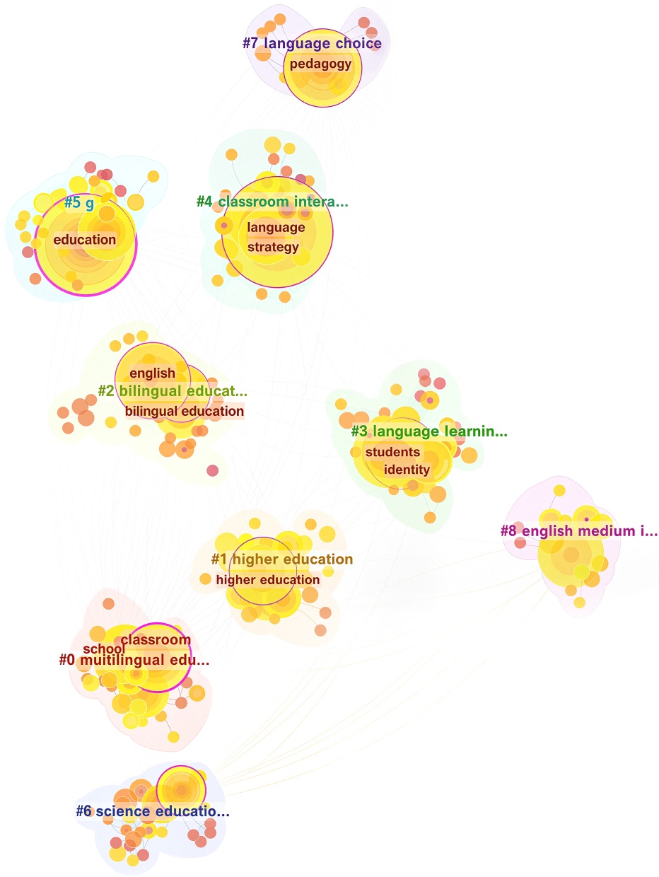 在图7中可以看出,9个大小大于10的集群(#0 foreign language development,#1 critical language curricularization,#2 informal assessment,#3 emi teacher classroom,#4 teaching,#5 student perspective,#6 science education,#7 communication strategies和#8 instruction classroom)以图形形式呈现,表明课堂情境下的超语研究主题包括几个主题或研究方向:① 语言教育:如“critical language curricularization”(关键语言课程设置)、“foreign language development”(外语发展);② 教学方法:如“instruction classroom”(课堂教学);③ 教育环境:如“emi teacher education classroom”(英语媒介教师教育课堂);④ 学生视角:如“student perspective”(学生视角);⑤ 教学策略:如“communication strategies”(沟通策略)。