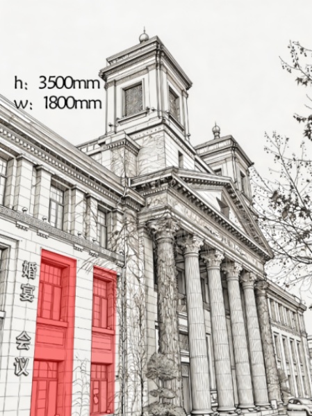 青岛德国总督楼旧址的屋顶坡度为35度,山形墙高宽比为1:1.2,拱券尺度为宽2.4米、高3.6米,构件之间形成稳定的重复关系,这种形式语言在视觉上营造出稳重、庄严与权威的空间感受(如图1)。