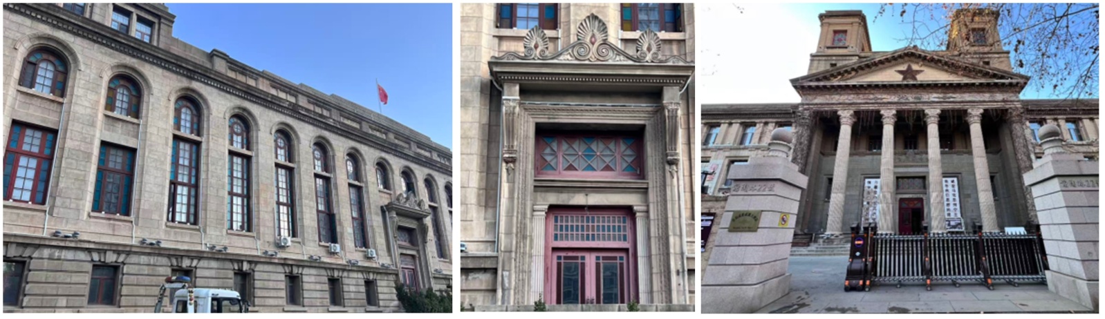 注:图中的日租时期青岛取引所,其装饰多附着于窗框、檐口与水平线条,强调几何秩序与功能导向,整体呈现低装饰密度与节奏性重复的视觉特征。