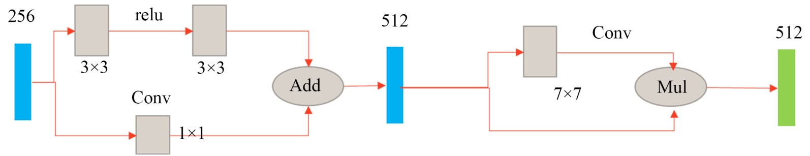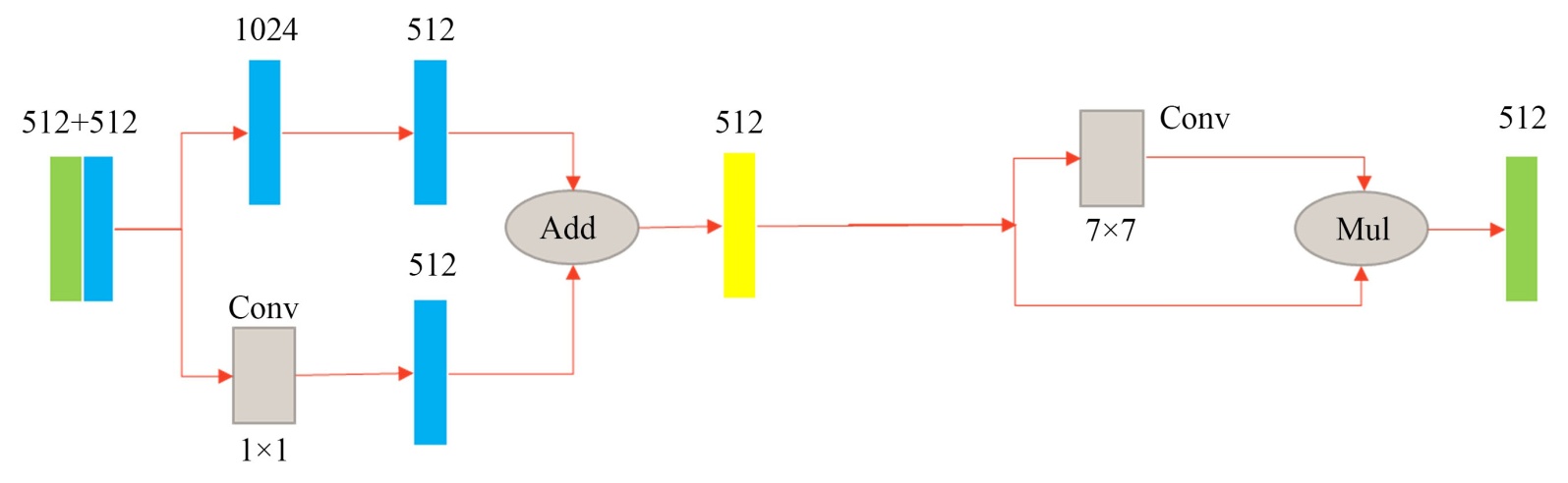 ,该机制包含两条路径:主路径通过残差块提取深层语义,旁路通过1 × 1卷积进行特征投影。两者相加实现多尺度信息的整合,计算公式如下: