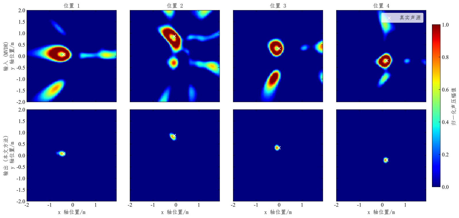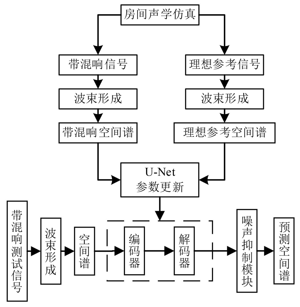 针对室内混响环境下MVDR算法易生伪峰的问题,本文提出一种基于改进U-Net的后处理方法。研究表明,该方法有效建立了观测谱与理想谱间的非线性映射,在保持高结构相似度(SSIM 0.9753)的同时实现了81.80%的伪峰抑制率,验证了将声源定位修正转化为图像去噪任务的有效性。