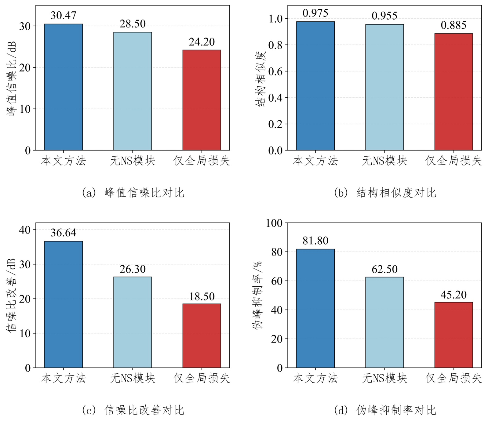 为了验证噪声抑制模块和复合损失函数设计的必要性,本节对比了完整模型、移除噪声抑制模块、以及仅使用全局损失函数三种配置下的性能表现,结果如图6所示。