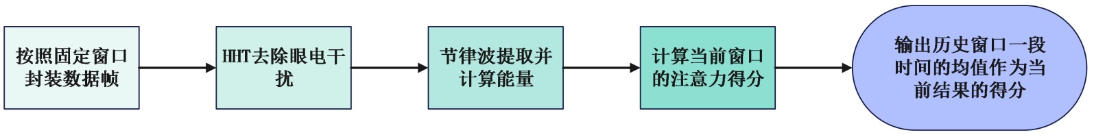 该算法以实时采集的原始EEG信号为输入,通过预处理、特征提取与融合、以及时间平滑等步骤,输出一个在[0, 2.5]范围内连续变化的注意力量化值,得分越高表示注意力越集中。整体流程如图3所示,其性能将通过与传统频域方法对比进行验证。