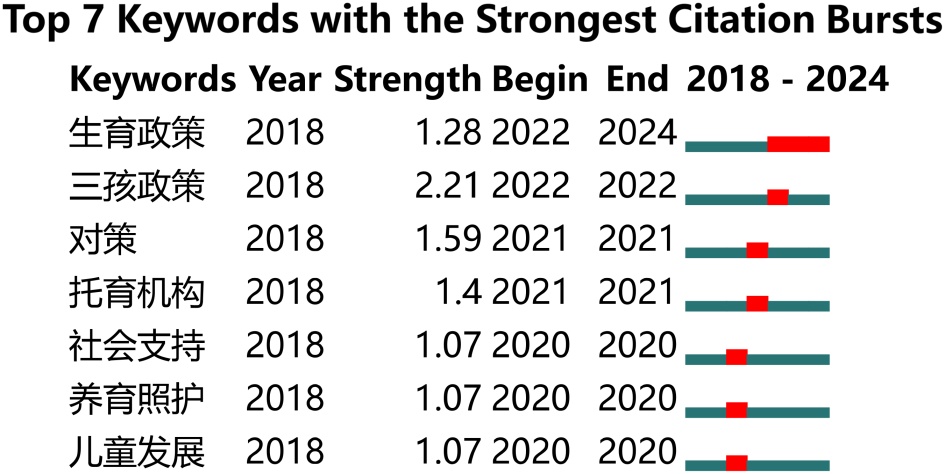 在某一时间段内词频贡献度陡增的关键词即为突现词(Burst Term),突现关键词代表着一个潜在的话题已经或者正在引起学术界超乎寻常的关注。通过突现词的变化能够把握某一研究不同时期新兴的趋势与转瞬即逝的潮流。突现值越高,说明该关键词受关注度越高。突现词的时间跨度代表其爆发周期,周期越长表明其持续影响力越大。因此,通过捕捉突现词的变化,人们可以发现该研究在不同时段内的前沿议题。图5呈现了婴幼儿照护服务研究的7个突现关键词、突现强度和突现时间。