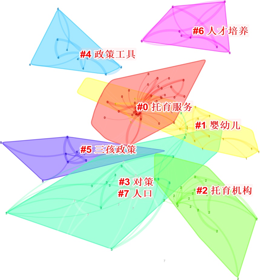 划分出来的社团结构具有显著性,当S值大于0.7就意味着聚类结果高效且令人信服。聚类图谱显示,Q = 0.6428,S = 0.939,说明本研究图谱的聚类效果显著且令人信服。通过聚类分析,得到七个聚类结果:#0 (托育服务)该聚类下主要内容有我国托育服务的建设目标,托育服务的实践模式,政策优化、托育需求等。#1 (婴幼儿)该聚类下主要内容有照护需求、家庭需求、养育照护。#2 (托育机构)该聚类下主要内容有服务体系、托育机构监管规则、治理取向、发展瓶颈。#3 (对策)该聚类下主要内容有幼有所育、家庭照护、家庭保教。#4 (政策工具)该聚类下主要内容有托育教师、托育政策、政策文本、公共服务设施、培训体系。#5 (三孩政策)该聚类下主要内容有早期教育、生育政策、生育意愿、社区托育。#6 (人才培养)该聚类下主要内容有专业建设、供需对接、供需矛盾、一专多能。#7 (人口)该聚类下主要内容有医保、健康脱贫。聚类编号数字越小,说明该聚类规模越大,其包括的关键词节点就会越多。