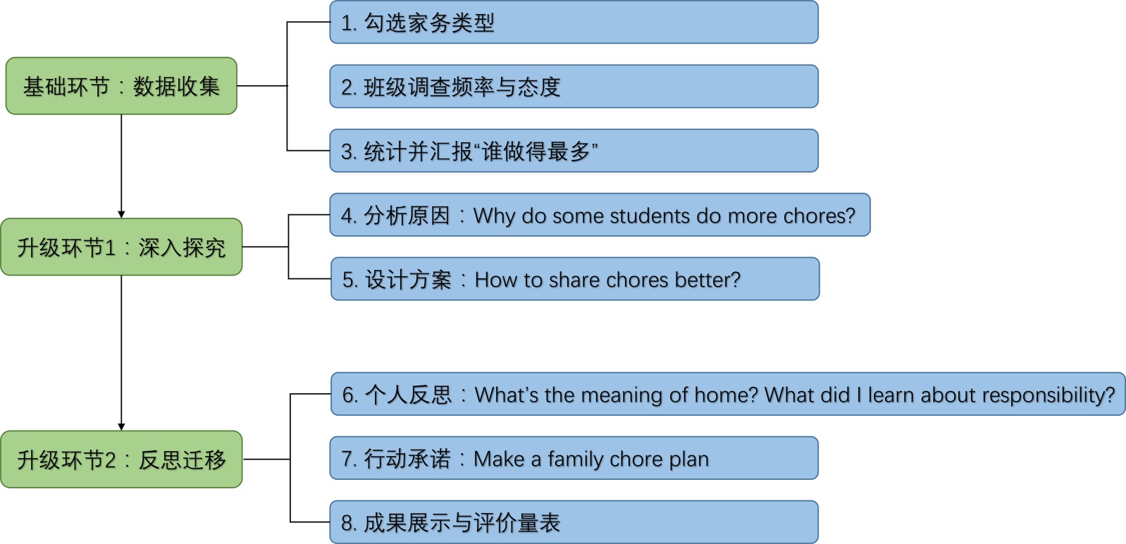 其三,一线教师需以PBL理念与核心素养为导向,对教材Project板块进行差异化使用与二次开发:对优秀案例可沿用核心框架并适当拓展,对待改进案例需补充探究深度与反思环节,将表层任务转化为完整的探究活动。