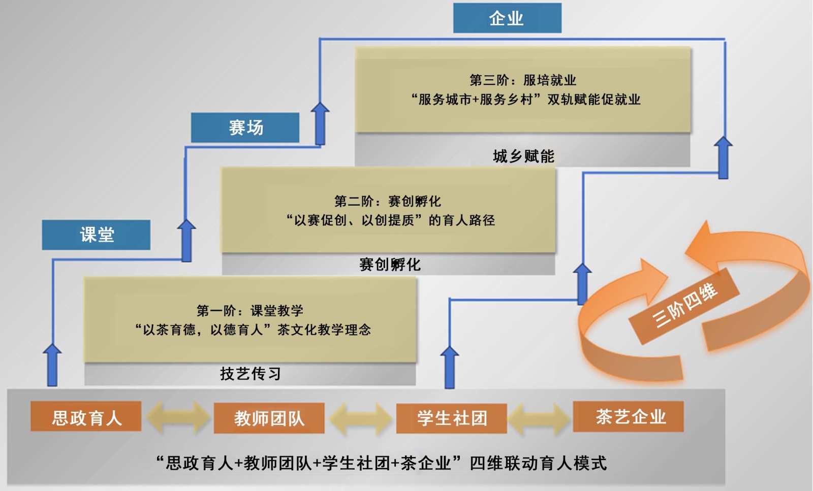 构建“课堂教学–赛创孵化–服培就业”三阶递进的茶文化育训新路径,打造“课程思政 + 教师团队 + 学生社团 + 茶产业”四维联动育人模式,实现了从课堂到赛场再到社会的全链条人才培养闭环。