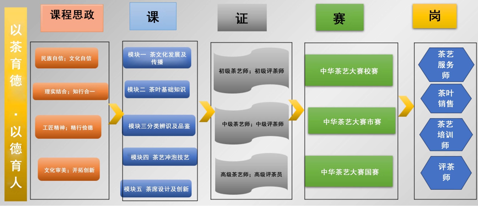 2) 整合茶文化知识,构建“课堂教学–赛创孵化–服培就业”的茶文化知识技艺传习完整链条。