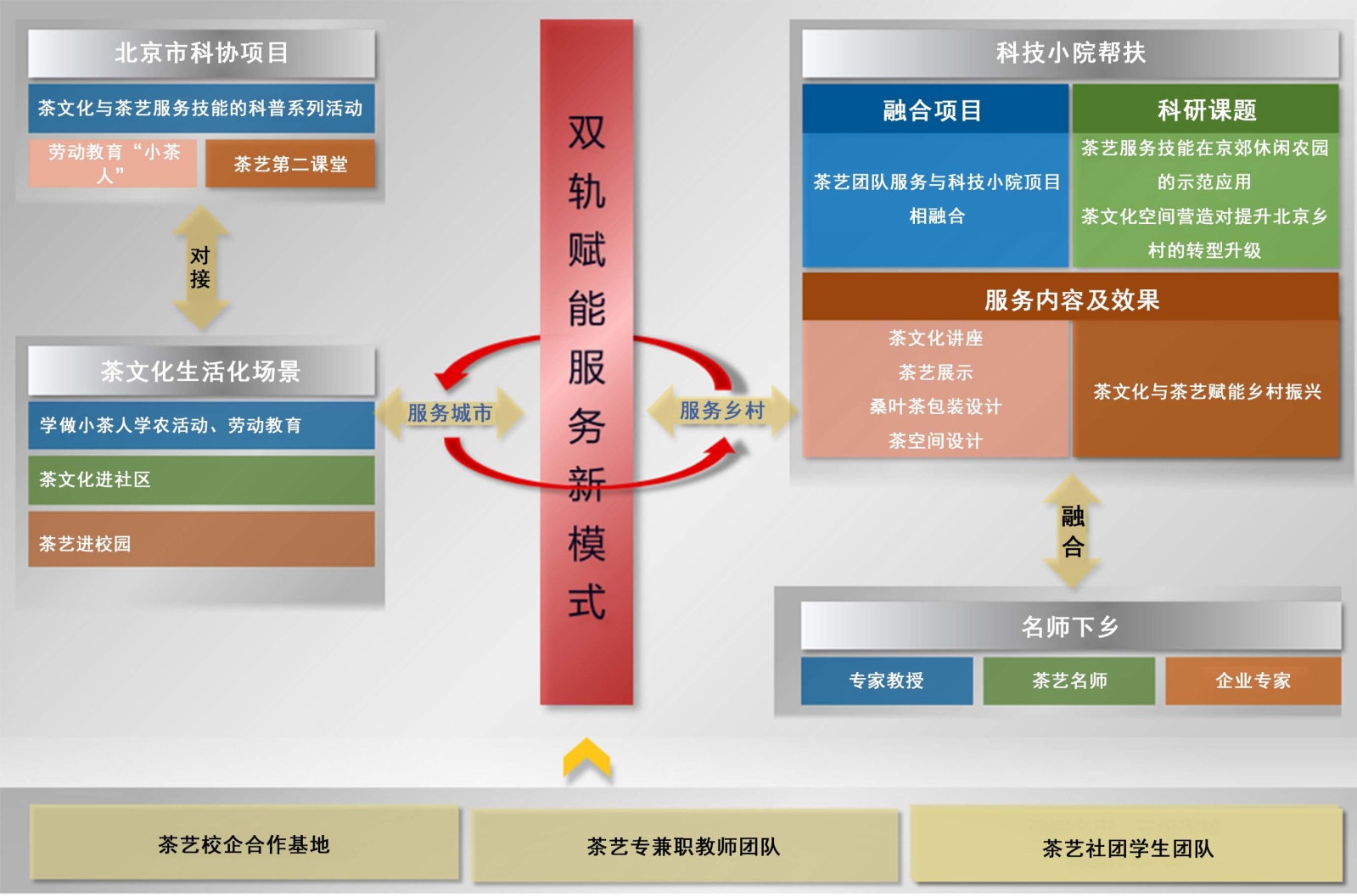服务乡村:名师下乡 + 科技小院帮扶。全国职业教育赋能乡村振兴发展优秀教师耿红莉教授、青年英才茶艺技师贾艳琼等,将茶艺团队服务与科技小院项目、科技帮扶课题有机融合,开展下乡茶文化讲座、桑叶茶包装设计、茶空间设计等服务,范围涉及京郊平谷、密云、门头沟、大兴等区,推动茶文化赋能乡村振兴。