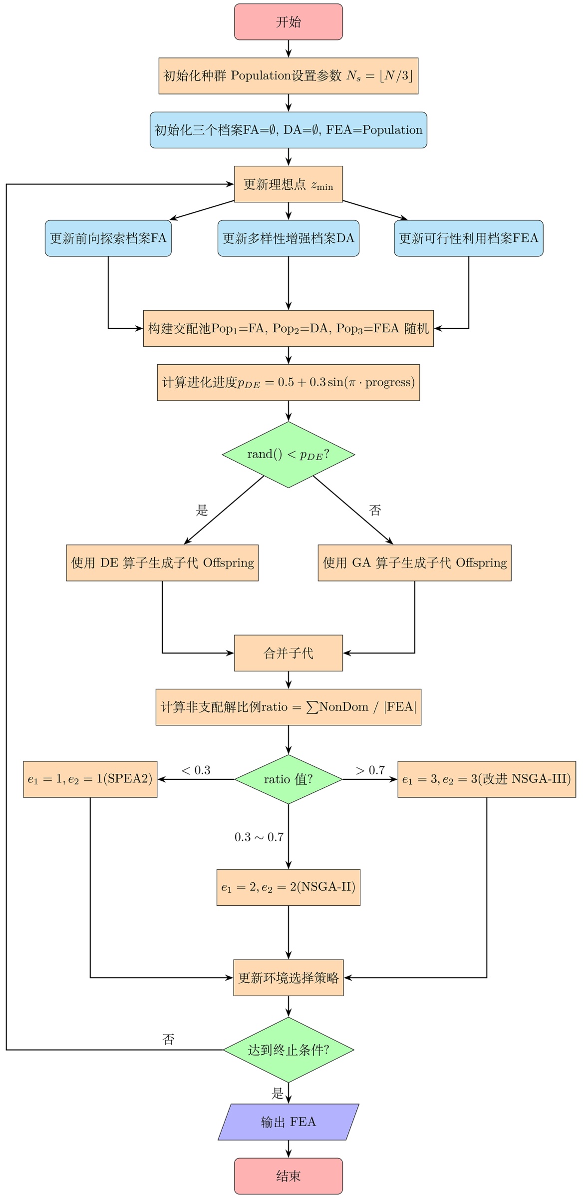 2. 多层次自适应机制:引入了基于进化代数的算子选择和自适应环境选择两层机制。基于进化代数的算子选择通过正弦函数动态调整DE和GA算子的使用概率,在不同进化阶段采用最合适的搜索算子。自适应环境选择根据非支配解比例动态切换SPEA2/NSGA-II/NSGA-III策略,适应不同的进化需求。