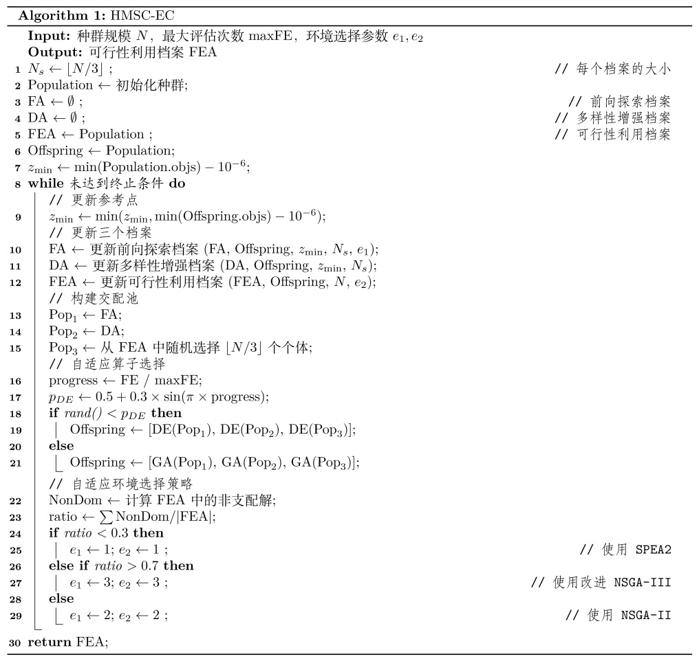 HMSC-EC的核心思想是通过三个功能互补的档案协同进化,在满足约束条件的同时实现收敛性和多样性的平衡。算法的伪代码如图1所示:
