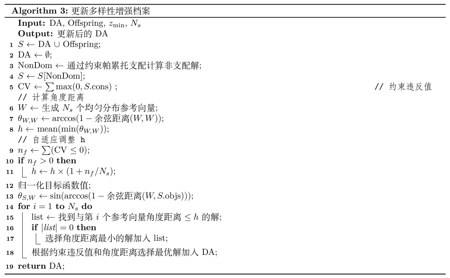 DA的设计目标是维持种群的多样性,确保解能够均匀分布在整个Pareto前沿上。DA采用基于参考向量和角度距离的选择机制,这种机制在处理复杂Pareto前沿形状时比传统的拥挤距离更有效。