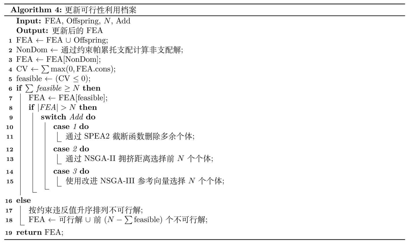FEA作为算法的主种群,专注于可行解的开发和利用。FEA采用约束Pareto支配进行筛选,优先保留可行解,并使用自适应环境选择策略进行截断,具体档案更新过程如图4所示。