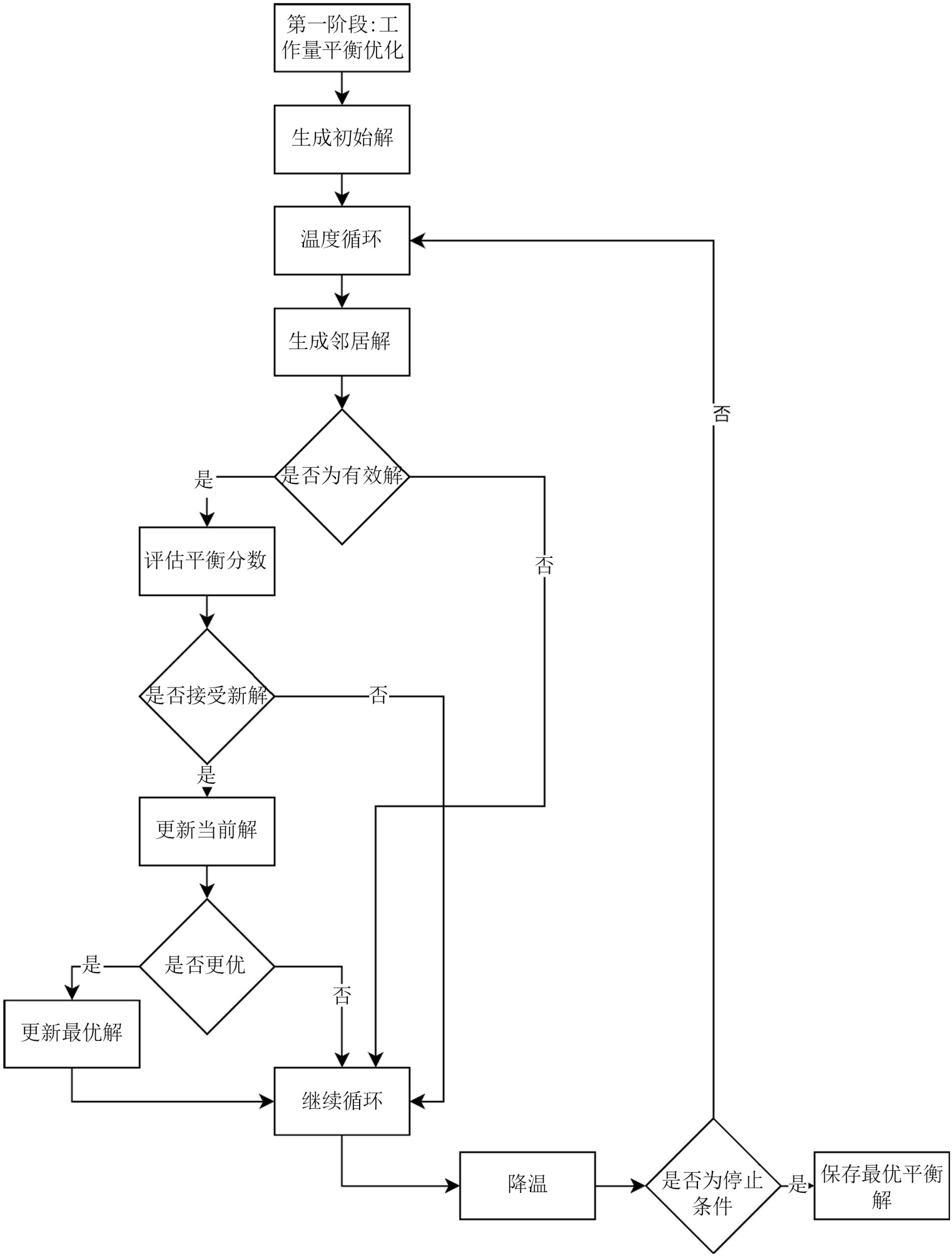 本文使用两阶段模拟退火算法来解决航班签派员分配问题。这是一种元启发式优化算法,结合了局部搜索和随机搜索的特点,专门用于解决组合优化问题。图1为算法流程图。