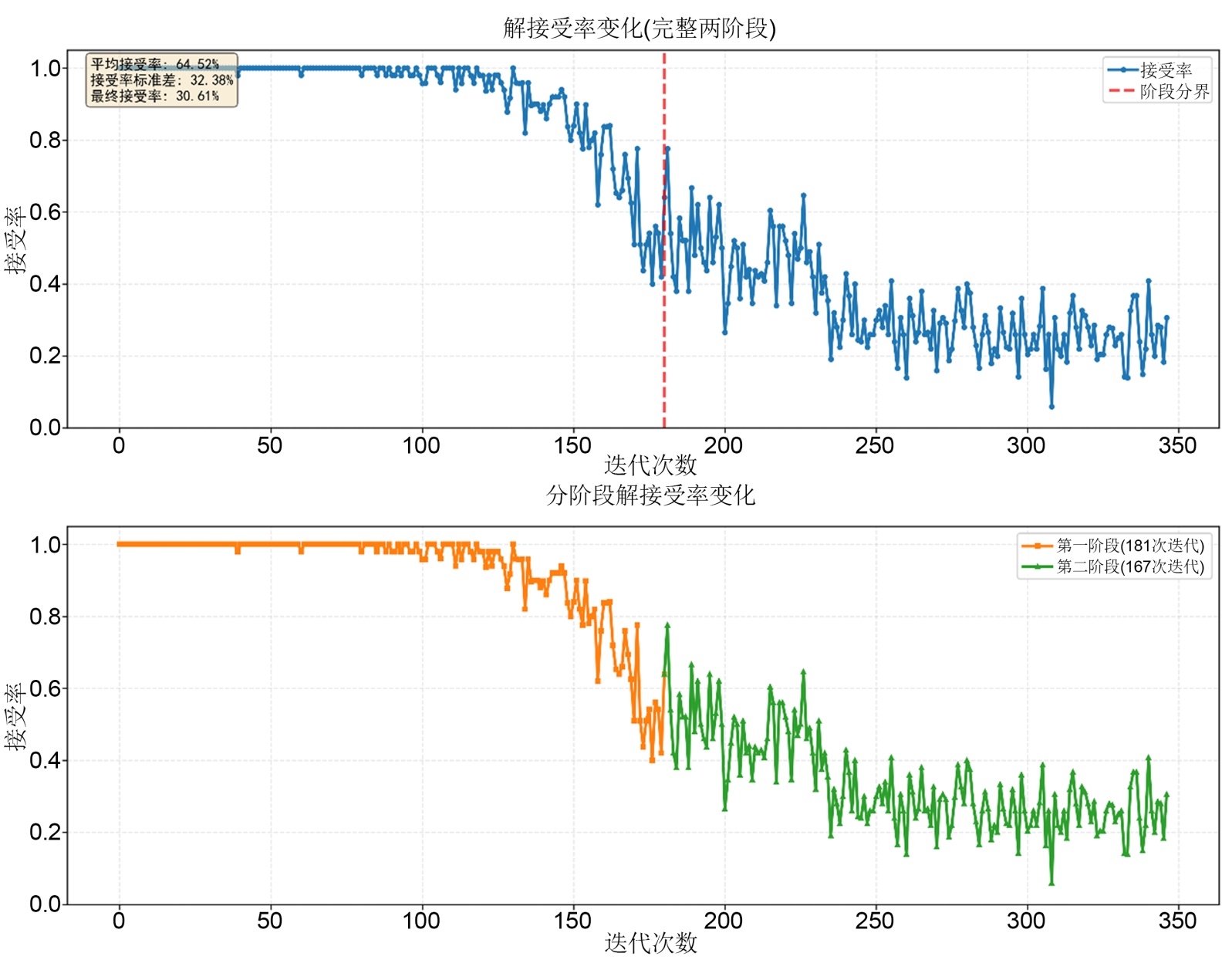 根据表3数据可知,在算法的成本优化能力方面,本文提出的二阶模拟退火算法取得了最优值20000,分别比遗传算法低1.0%、比蚁群算法低2.0%。从成本降低率来看,二阶模拟退火达到10.3%,显著高于遗传算法的7.9%和蚁群算法的5.3%。这一优势主要得益于算法的两阶段设计:第一阶段确保工作量均衡,第二阶段在容忍度范围内进一步优化成本,有效避免了过早陷入局部最优。在解的质量稳定性方面:遗传算法在成本方差指标上表现最优(30.69),表明其解的分布最为集中。二阶模拟退火算法方差为196.42,处于可接受范围。蚁群算法方差高达2422.25,说明其解的质量波动较大,稳定性较差。遗传算法的选择操作保留了优良基因,而蚁群算法的信息素更新机制在本问题中易导致收敛不稳定。在工作量均衡性分析方面:工作量均衡是签派员任务分配的核心约束之一。二阶模拟退火算法的工作量标准差仅为0.5,远优于遗传算法的1.5984和蚁群算法的5.7069。这一显著优势源于算法第一阶段的专门优化:通过轮询初始化策略和均衡导向的邻域搜索,确保了各签派员负荷高度均衡。在计算效率方面:二阶模拟退火算法仅需12.36秒,比遗传算法快19.1%,比蚁群算法快81.5%。二阶模拟退火的高效性体现在:第一阶段快速获得均衡解;第二阶段在优质解基础上局部搜索,避免全局重复探索。对于算法的收敛性分析,两阶模拟退火算法与蚂蚁算法和遗传算法相比,收敛曲线平滑可控,避免局部最优能力强,收敛稳定性最好。解接受率在理想范围内(20%~40%),表明算法参数设置合理。图4是解接受率图。