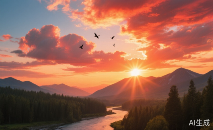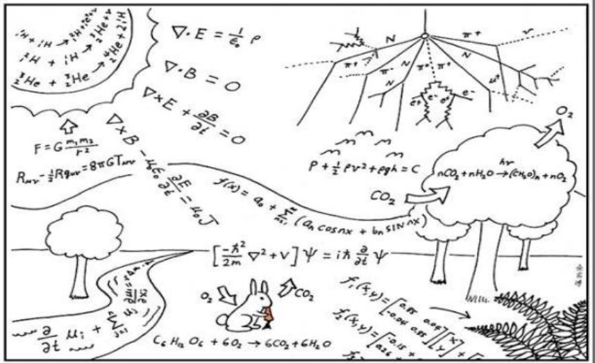 物理学是探索物质世界基本结构、相互作用与运动规律的自然学科。其源于人类对自然秩序的理性探索,发展过程中催生了系统的科学研究方法,即通过将复杂的自然现象模型化,在物理模型上探索和解析其物理规律。图1展示的是一幅AI生成的风景照(左)和其中的物理规律(右)。左图风景中包含山川河流、森林树木和白云霞光等自然现象。右图是对自然世界运行现象的模型简化,并揭示其中蕴含的物理规律(见表1)。如《庄子·天下篇》所言的“判天地之美,析万物之理”,物理学研究包罗万象,从牛顿万有引力定律描述的天体运行和苹果落地,到麦克斯韦方程组解释的闪电与霞光原理,再到流体力学揭示鹰击长空鱼、翔浅底的规律,以及量子力学和相对论对微观与高速世界的探索。此外,图1中还展示了聚变反应和光合作用方程式,以及描述周期性变化规律的傅里叶级数等其它物理、生物和数理现象。从物理学的自身特征和发展规律出发,大学物理教学过程也遵循了相应路径,即观察自然,分析现象,提炼规律这样的基本教学模式[14] [19],该模式训练了大学生的科学思维和科学素养,同时也是初高中的物理课程教学的常用方法[20]。