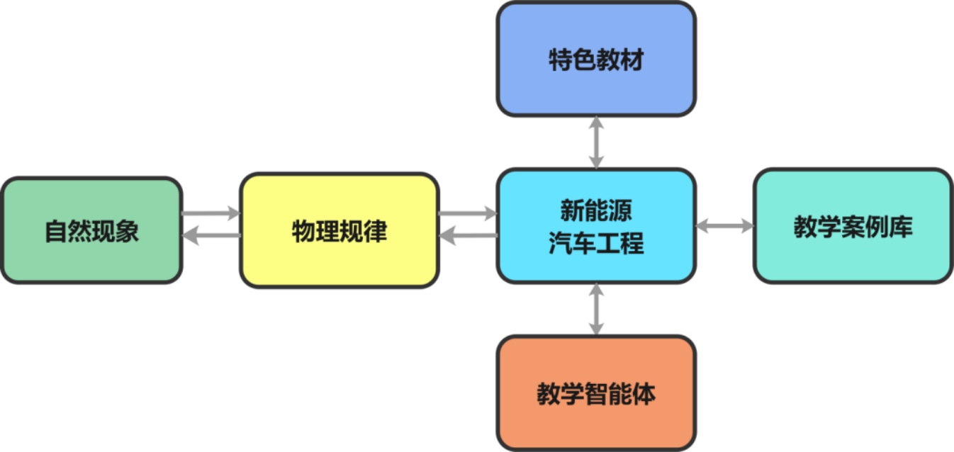 把新能源汽车作为教学载体的理念满足了2003版课程大纲“强化现代”的新要求,课纲的“专业衔接”是教学实现的核心,即通过三个教学维度整合教学内容,分别是服务于课堂教学的教学资源库整理、围绕物理规律在汽车中应用的新工科大学物理教材的编写,以及汽车中科学规律智能体的构建。教学资源库通过“湖北汽车工业学院本科课程教学案例库建设项目:《大学物理》课程教学案例库”进行建设,案例库对车辆结构、零部件系统、智驾模式以及制造测试等汽车上下游产业链进行全方位的挖掘,整合了大学物理中的力学、热学、光学、电磁学和量子力学等主干教学内容在汽车中的典型应用。案例库重点整理的是电磁学和近代物理相关物理原理和定律在新能源汽车技术中的实现,比如,永磁同步电机的材料性能和通电线圈的旋转如何实现电磁能和机械能的转换,狭义相对论中的时间膨胀效应对卫星时钟误差的修正以提升汽车导航的定位精度,量子力学对电子能级跃迁解释和激光雷达原理等。在教学实践基础上,通过湖北省教育厅新工科项目和湖北汽车工业学院数字教材建设项目推动《新工科大学物理》的教材编写,实现教学内容的标准化和系统化。