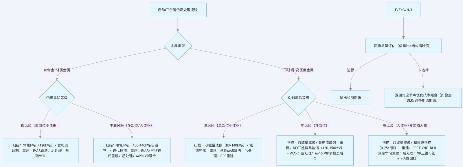 技术顺序:硬件扫描(kvp + 管电流)→能谱处理(纯化/vnc)→迭代重建(imar/dlr/三维迭代)→后处理(mpr/vr/cpr),不可颠倒流程[2]。