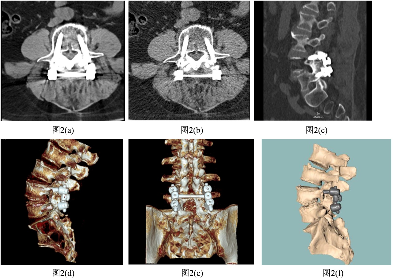 3. 多技术融合图像,见“图2(c)~图2(f)”:采用100/140 kvp双能量 + dlr (骨骼模型) + 三维迭代重建 + vr组合方案,螺钉形态、椎体骨质及椎管清晰可辨,准确评估螺钉位置无松动,椎管无狭窄(vr图像直观展示内固定系统整体形态,便于医患沟通) [9]。融合技术适配低原子序数金属特点,双能量保证对比度,dlr平衡噪声与细节,三维迭代 + vr提升空间显示效果,兼顾诊断与沟通需求[8]。