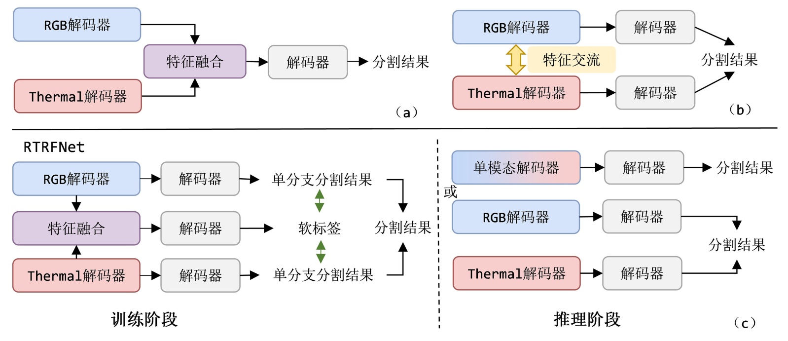 图1. RGB-T分割训练范式架构对比
