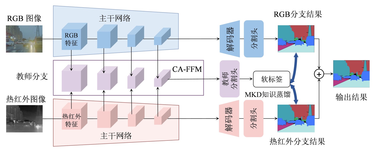 个语义类别。由于教师头已经通过CA-FFM模块预先融合了来自可见光的高频几何结构与热红外的补充特征,其生成的软概率分布