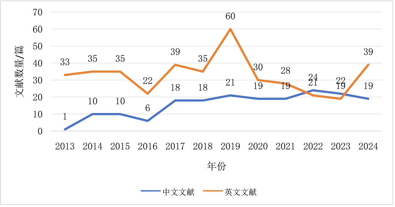 该图表对比了2013年至2024年间,以“新型农业经营主体促进农民增收”为主题的中英文研究文献数量的年度变化趋势。总体来看,中文文献数量从早期远低于英文文献,到2017年后快速增长,并在2022年首次实现反超,反映了该研究议题的关注重心和政策实践驱动已从国际学界向国内本土研究显著转移。英文文献数量在2019年达到峰值后有所回落,但2024年呈现回升态势,表明国际学术界对该议题仍保持一定关注,并可能出现了新的研究热点。