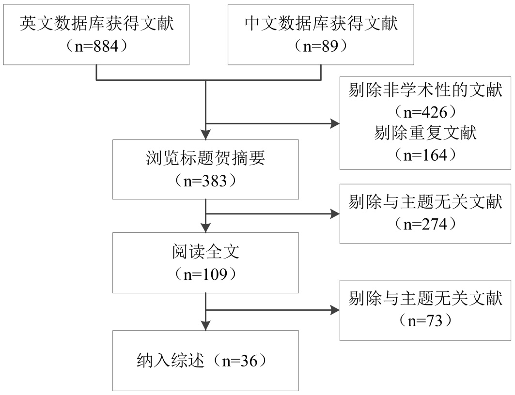 研究采用2名研究人员独立筛选文献,遇到分歧时由第3名研究人员介入讨论并作出最终决定。阅读并提取标题、作者、国家、发表时间、研究设计、研究目的、研究对象和研究结论等信息,根据纳入和排除标准对文献进行筛选、核查和整理,最终纳入符合研究目的的文献36篇(图1)。