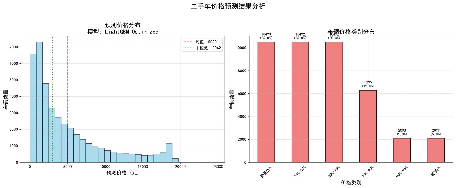 本研究针对二手车价格预测问题,构建并比较了多种机器学习模型。实证结果表明,基于梯度提升框架的LightGBM模型综合性能最优。该模型在测试集上取得了平均绝对误差(MAE) 487.03元、平均绝对百分比误差(MAPE) 13.20%的预测精度。这意味着,对于一辆价值10万元的二手车,模型的平均预测偏差约为1.32万元。在高度非标准化的二手车交易场景中,MAPE低于15%通常被视为具有较高的商业实用价值,这表明本文所构建的模型已能满足初步估价、市场分析等实际业务需求。