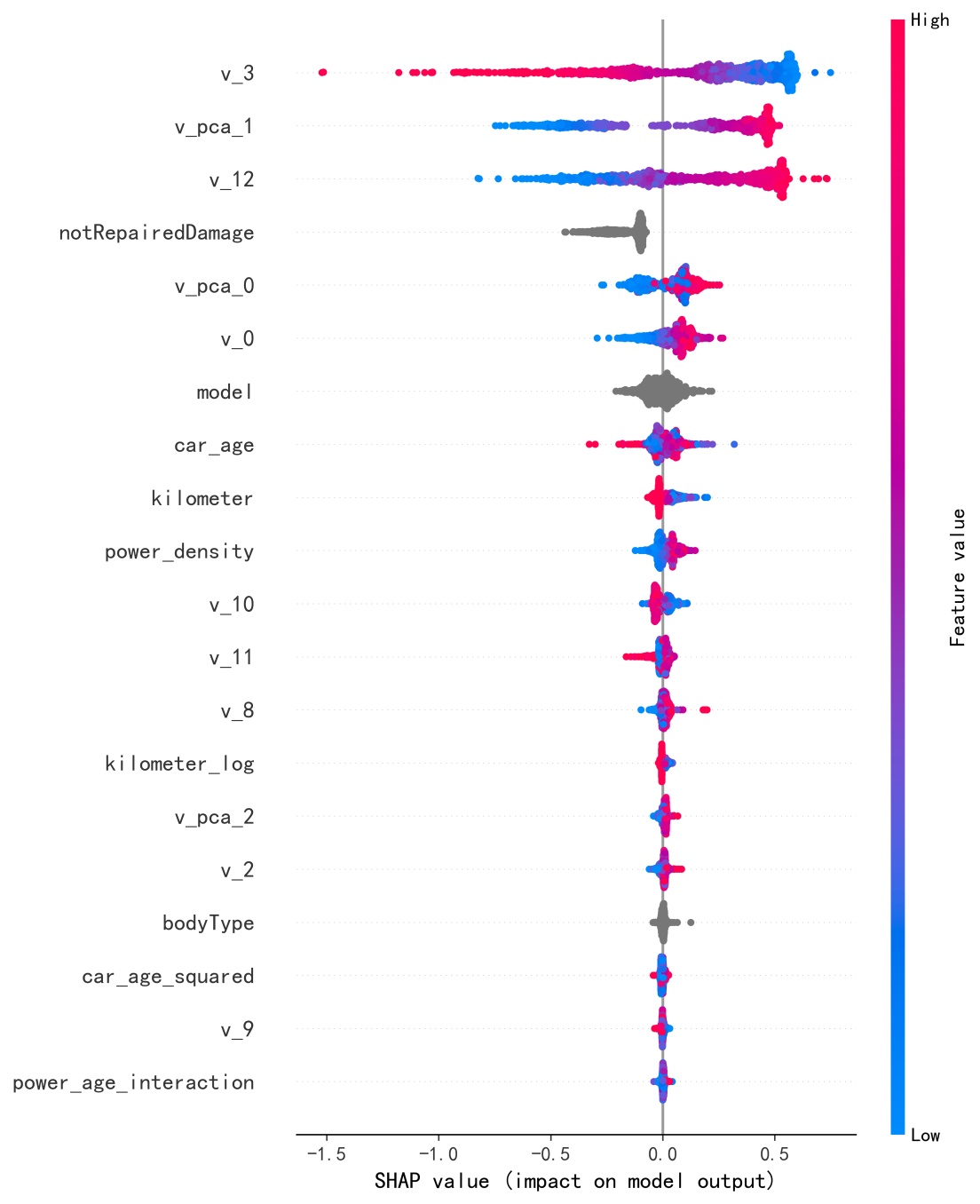 由图可知,模型预测能力主要由前5个特征贡献,按重要性排序依次为:v_3、v_pca_1、v_12、notRepairedDamage、v_pca_0。其中,notRepairedDamage作为分类变量位列第4,表明车辆损伤状况对二手车价格具有显著影响,有损伤的点全部集中在左侧,对价格造成负面影响,损伤拉低价格,这与二手车市场的业务常识高度吻合;v_3作为重要性最高的特征,呈现出独特的非线性影响模式:v_3几乎粉红色点都集中在中心线左侧蓝色点都集中在中心线右侧,特征值较小时,当特征值较小时,shap值为较大的正值,对价格产生显著的推高作用;随着特征值增大,正面影响逐渐减弱,当特征值达到较高水平时,shap值转为负值且绝对值较大,对价格产生强烈的拉低效应。这种“低值推高、高值拉低”的非单调关系表明,v_3可能代表了某个具有最优区间的特征变量;v_pca_1、v_12、v_pca_0等特征呈现出一致的线性影响规律:蓝色点(低特征值)集中在shap负值区域,粉红色点(高特征值)集中在shap正值区域。这表明这些特征的取值与价格呈正相关关系—特征值越低,越拉低价格;特征值越高,越推高价格。其他降维特征如v_pca_2也遵循相同的规律,反映了PCA主成分所代表的综合因子对价格的线性正向驱动作用;kilometer特征的shap分布显示:粉红色点(高里程)主要集中在负值区域,蓝色点(低里程)主要集中在正值区域。这表明里程越高,对价格的负面影响越大,越拉低价格;反之,低里程车辆对价格产生正向贡献。模型准确捕捉了“里程越高、贬值越严重”的市场规律;车龄特征(car_age)的shap分布呈现以下特点:低车龄样本(蓝色点)在零点两侧均有分布,表明新车并不必然推高价格——当与其他负面特征(如高里程、损伤记录等)共同作用时,低车龄也可能产生负向贡献;高车龄样本(粉红色点)则主要集中在负shap区域,反映车龄增长对价格的普遍拉低效应。这一分布特征印证了车龄作为核心定价因素的复杂性,其影响受其他特征调节,存在明显的交互效应。车龄平方项(car_age_squared)的shap分布范围较原始车龄特征明显收窄,点集更紧密地聚集于零点附近。这表明平方项主要用于捕捉车龄对价格的加速贬值效应——即在车龄较高阶段,单位时间贬值幅度加大。但其对整体预测的贡献相对有限(特征重要性排名第18),说明原始车龄特征已能较好地刻画车龄与价格的主要线性关系,平方项仅作为非线性补偿。