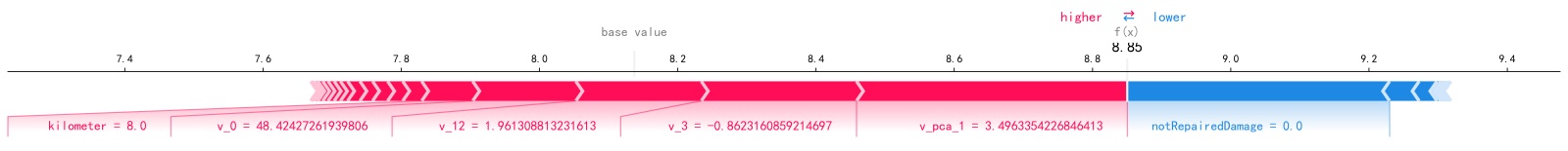 力图(Force Plot)用于直观地展示单个样本的shap值及其对模型预测结果的影响,通过力图,可以清晰地看到每个特征对该样本预测值的贡献。下面对具体样本进行力图分析,如图7。图中的起点base valuc表示模型的基线值,终点表示模型对该样本的最终预测值,这是基线值加上所有特征贡献的总和,在这里为8.85 (价格对数化后结果),相对于基线值最终预测值变大表明所有特征整体上产生了正向贡献。每个特征的贡献通过带颜色的条表示,条的长度表示该特征对最终预测值的影响大小,红色条表示正向贡献,即该特征使预测值增加,蓝色条表示负向贡献,即该特征使预测值减少。从图中可以看出特征kilometer取值为8.0,v_0取值为48.42,v_12取值为1.96,v_3取值为-0.86,v_pca1取值为3.50时产生较大正向贡献,而有损坏的情况负向贡献最大,是主要拉低价格因素。