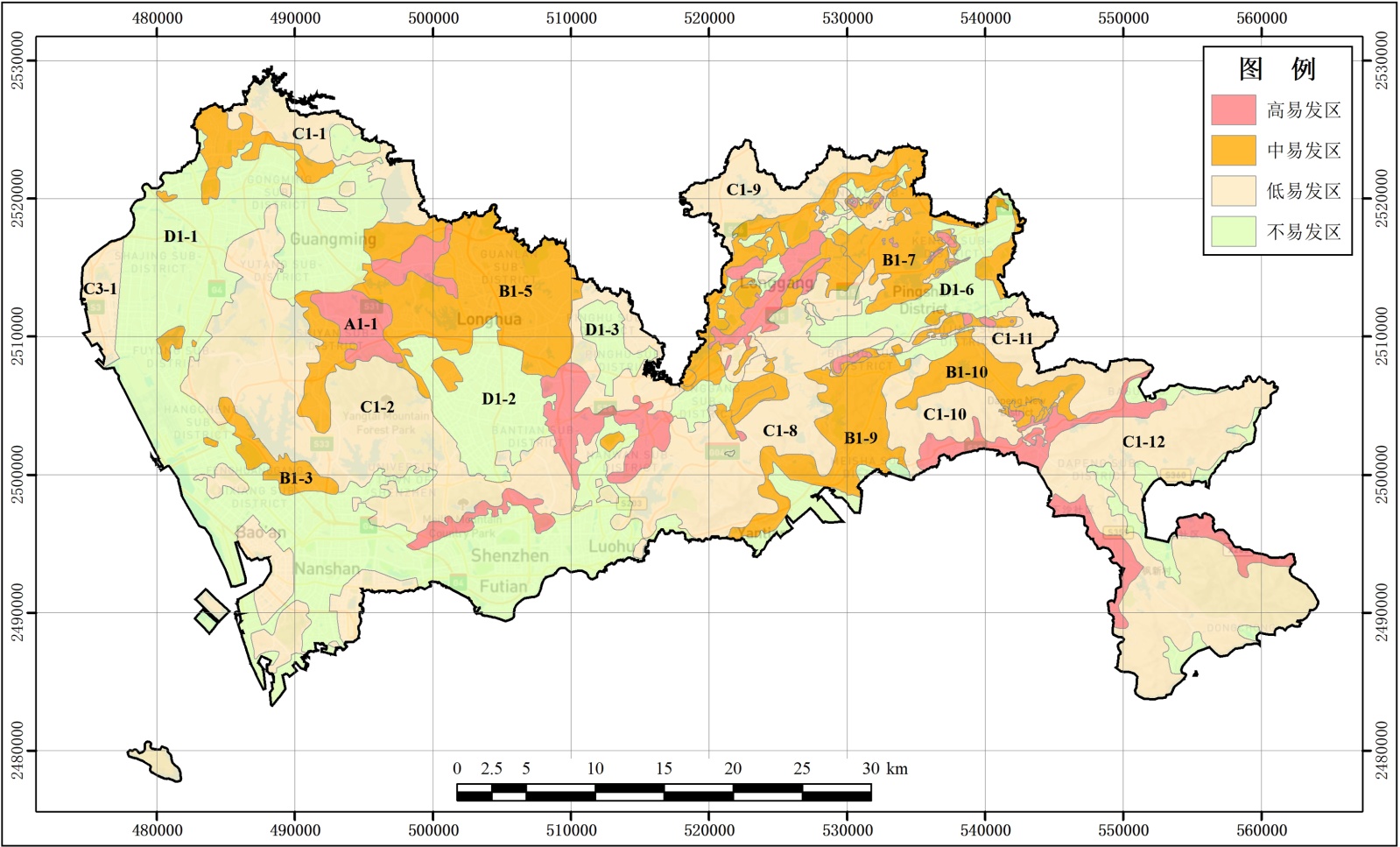图1. 深圳市地质灾害易发分区图