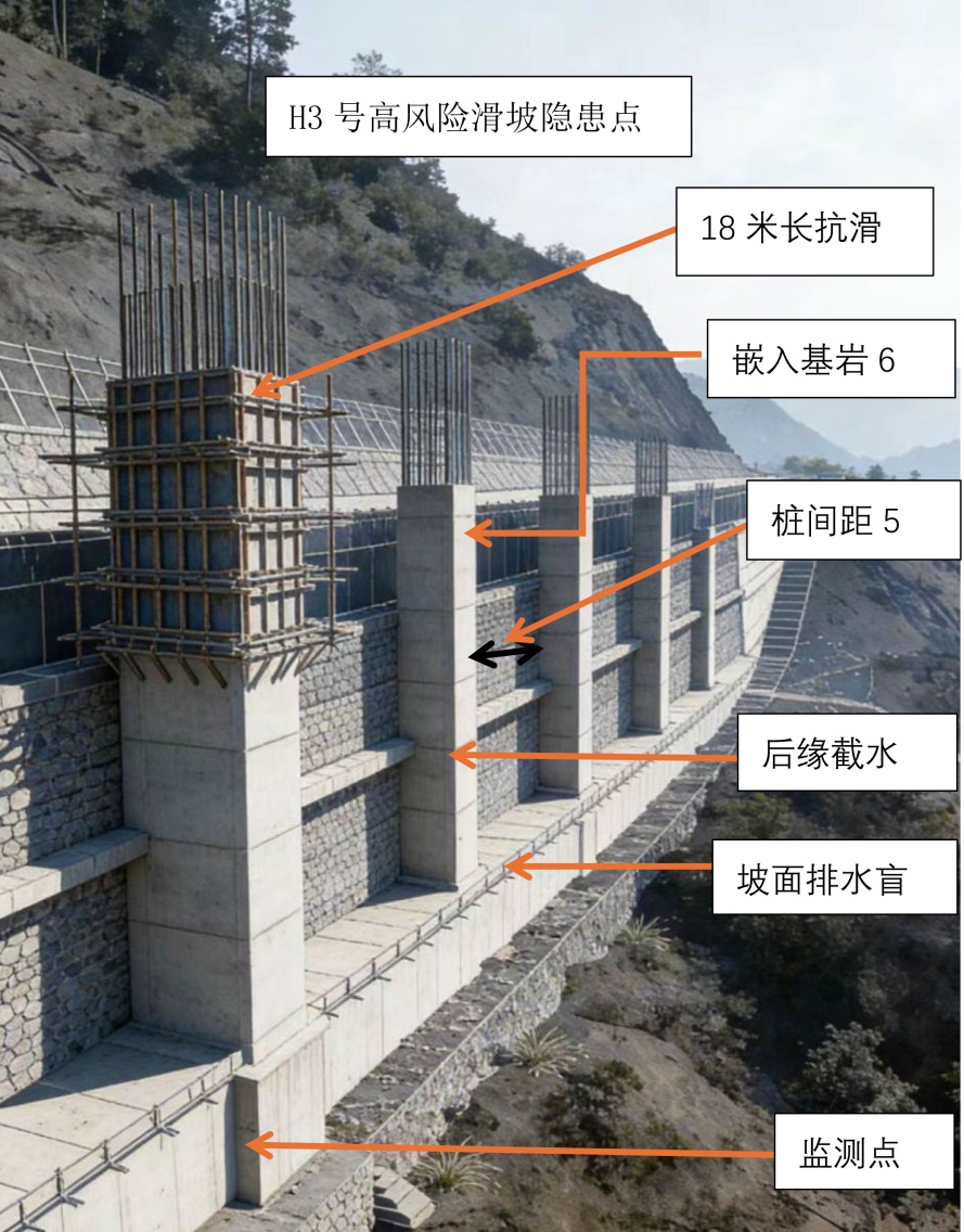 图2. H3号高风险滑坡隐患点工程治理剖面示意图
