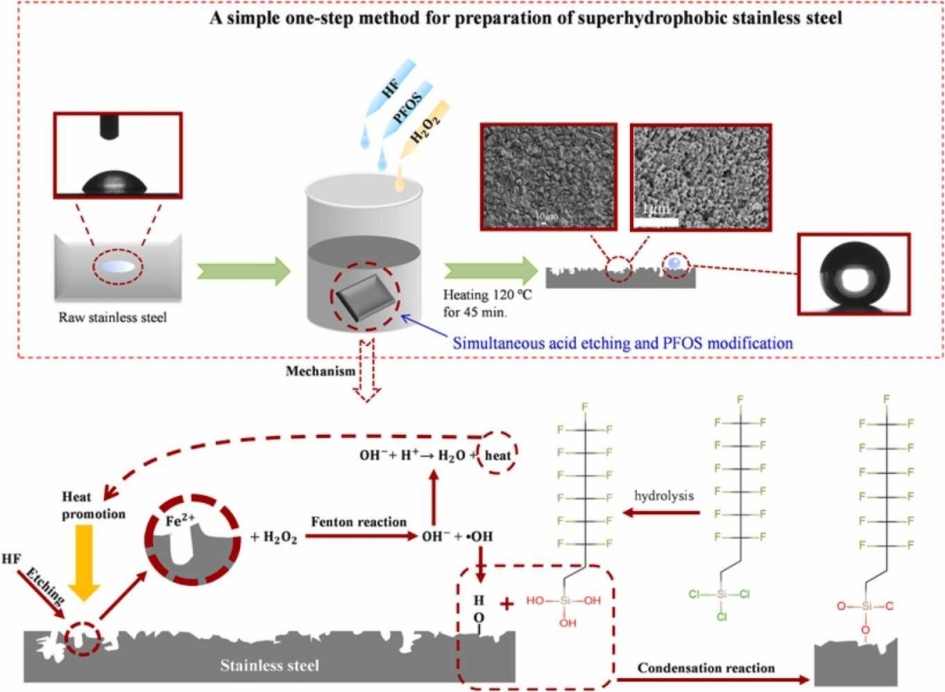 图1. 通过H2O2、HF和PFOS一步制备超疏水表面