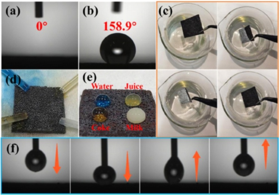 Figure 2. Hierarchical micro/nano structured iron foam fabricated by chemical etching and surface modification: (a) (d) Surface wettability before modification; (b) (e) Surface wettability after modification; (c) Aerophilicity of the hydrophobic surface; (f) Hydrophobic iron foam surface with extremely low adhesion