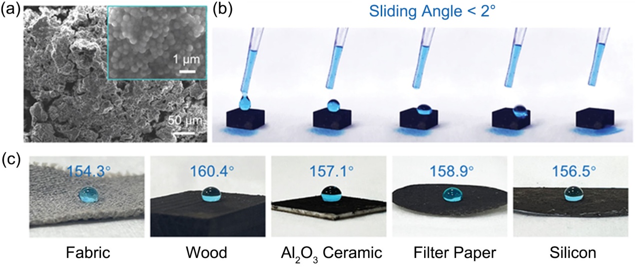 Figure 5. Superhydrophobicity achieved by self-assembled SiO2@polydopamine core-shell nanosphere coating: (a) SEM image of the modified Nd-Fe-B surface; (b) Rolling behavior of a water droplet on the modified Nd-Fe-B surface; (c) Superhydrophobicity enabled on various substrate surfaces by the PDA-doped SiO2 particle coating