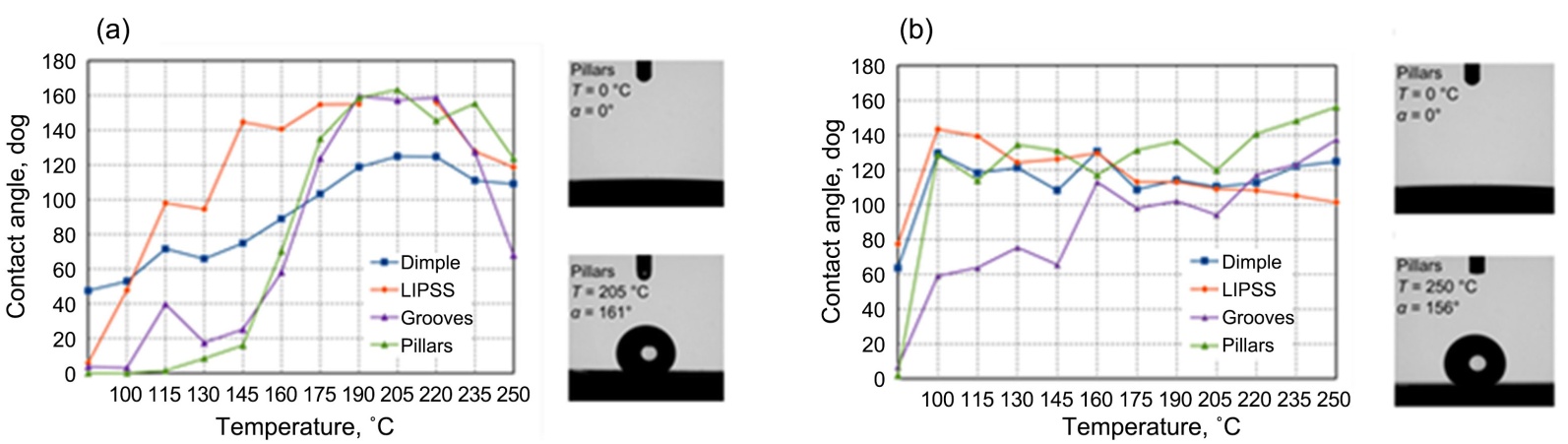 2022年,Cereska D等人[27]使用飞秒激光加工协同梯度热处理的方案,在铝、不锈钢等工业金属合金表面上制备出按需调控的润湿性表面。实验证实,相同/微调的激光参数可适配多种合金,结合100℃~250℃梯度热处理后,可快速转变为疏水/超疏水。结果如图6所示。其中铝可调性最强(接触角0˚~161˚),钢在100℃以上即可实现超疏水,疏水表面性能可以维持10个月。