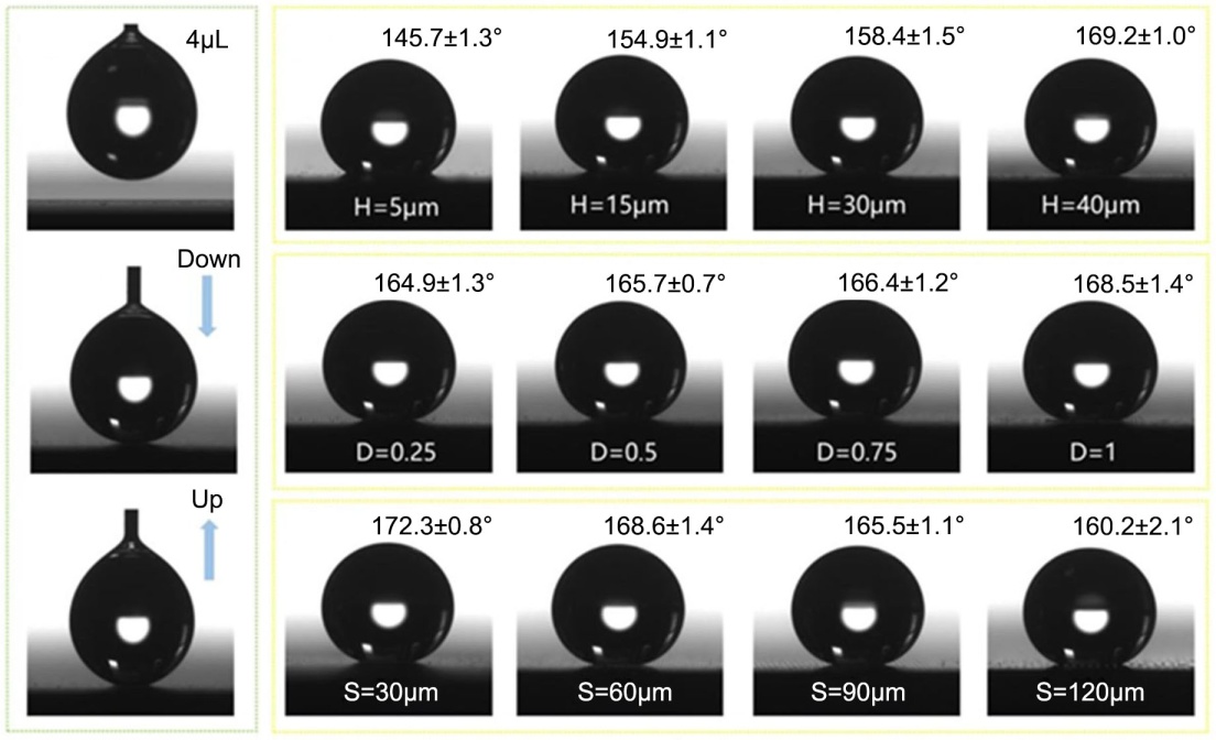 ),也可以通过合理的微观结构设计,使其表观接触角超过150˚,实现超疏水性能。