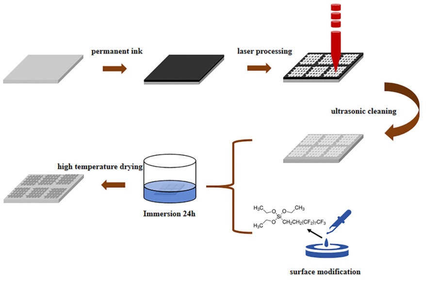 Figure 8. Enhanced hydrophobicity on silicon surfaces via femtosecond laser construction of micro/nano structures combined with chemical modification