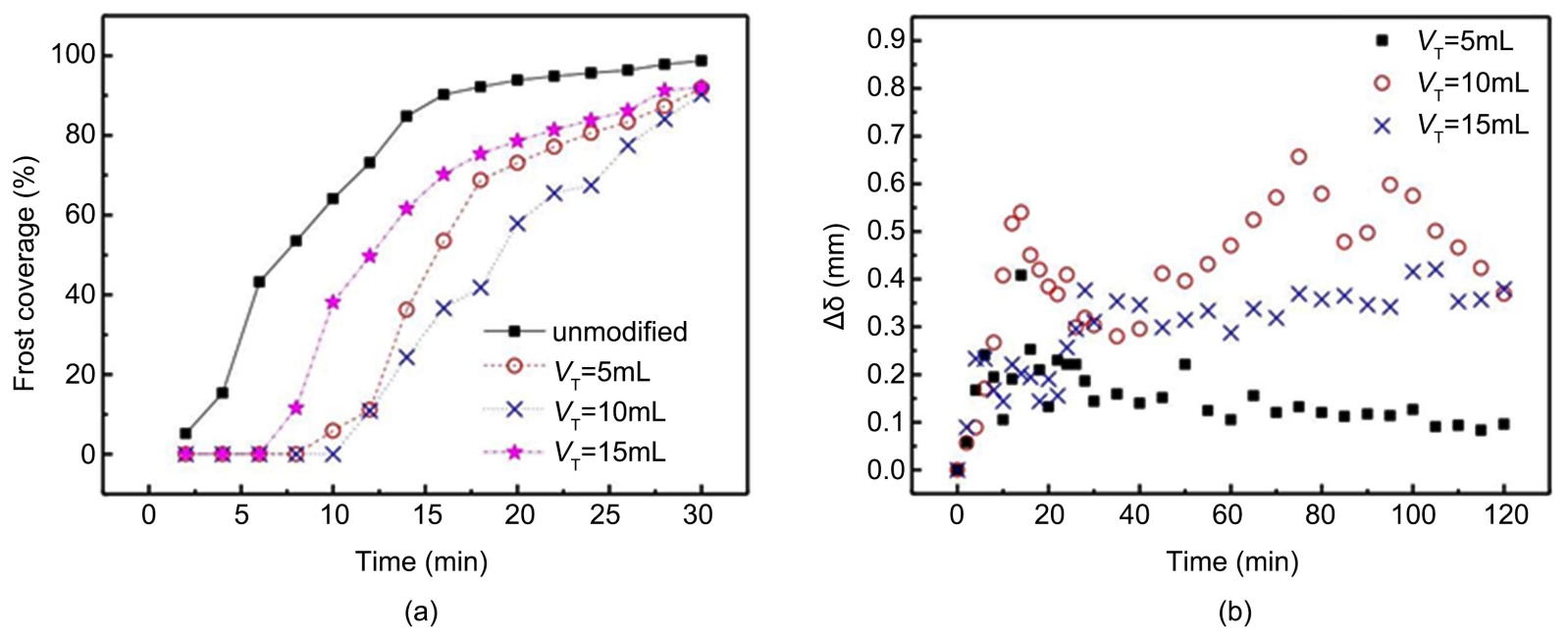 Figure 11. SiO2@TEOS coating delays frost formation (a) and reduces frost thickness (b)