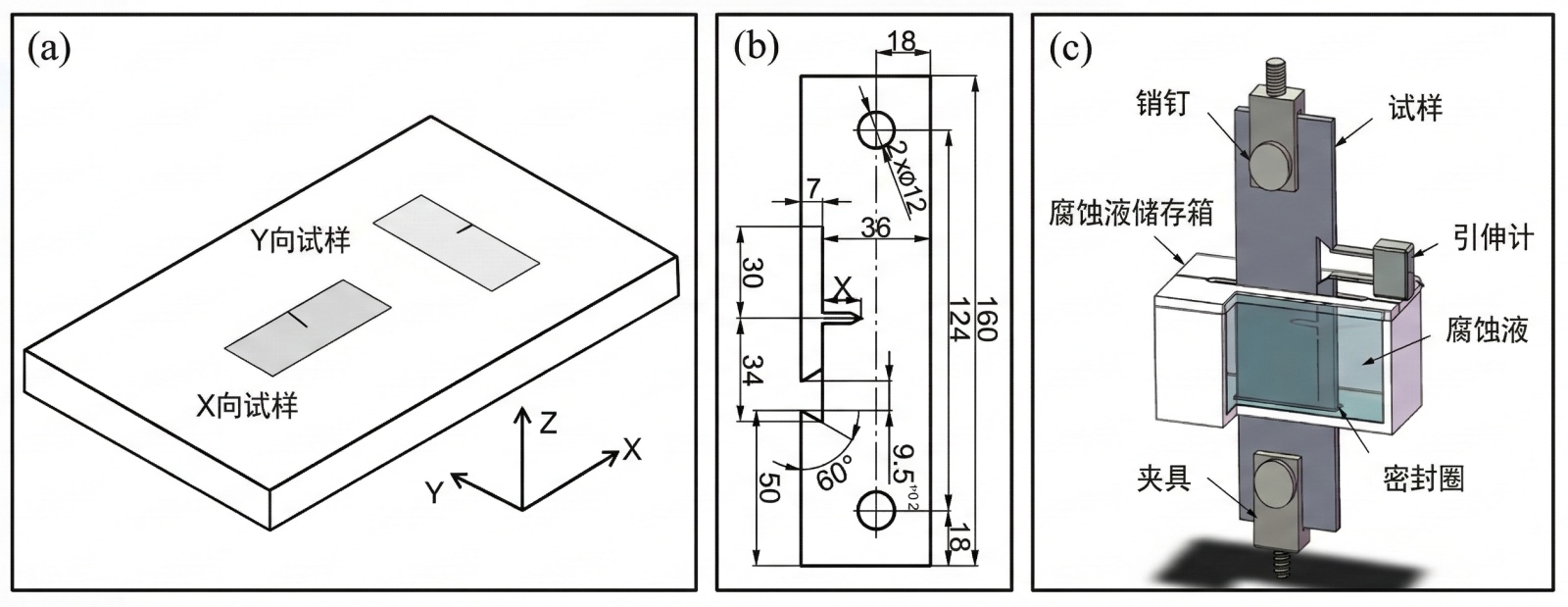 图1. 试验设计:(a) 取样位置 (b) 试样尺寸 (c) 腐蚀疲劳裂纹扩展试验装置