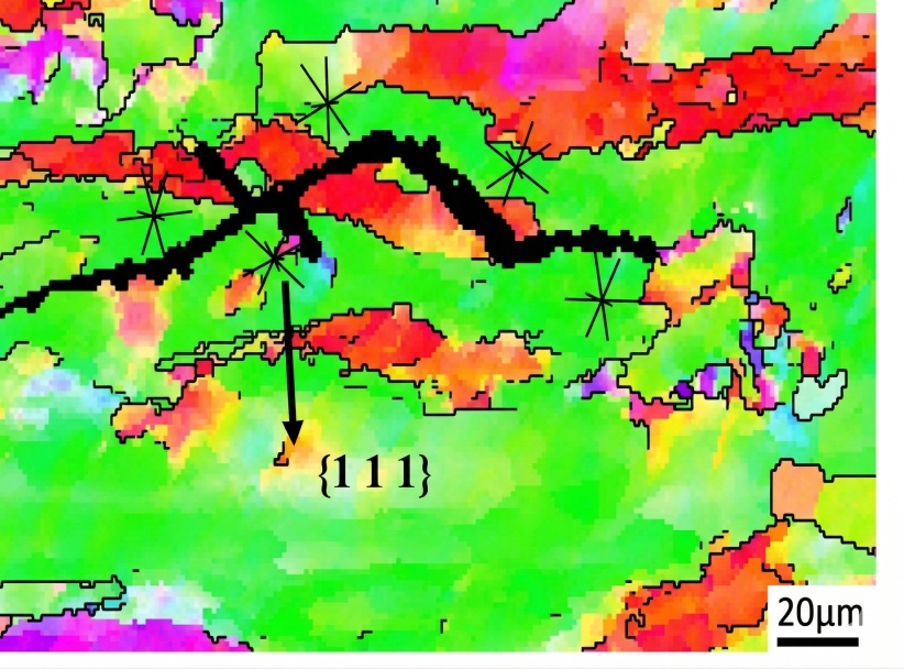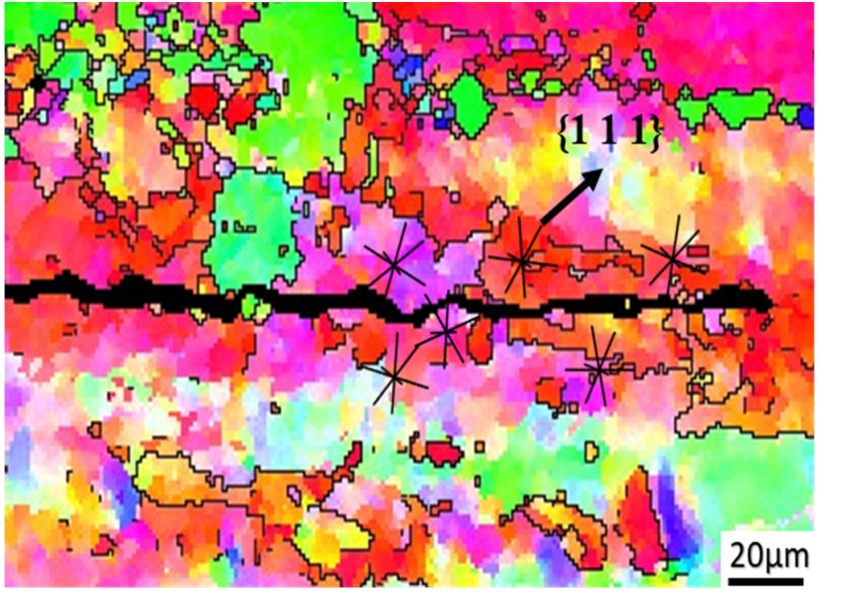 相较于晶内,PFZ区域无强化相,强度与塑性更低,在循环载荷下易产生塑性变形,导致氧化膜反复破裂,新鲜Al基体持续暴露,形成“溶解–开裂–再溶解”的循环,加速裂纹沿PFZ的扩展。X向试样晶界以小角度晶界为主,PFZ呈连续的定向分布,裂纹沿PFZ扩展时路径相对平直,偏转少;Y向试样大角度晶界占比高,PFZ分布杂乱,裂纹沿PFZ扩展时频繁偏转,且大角度晶界的电化学电位差更大,阳极溶解速率更快,加剧裂纹扩展。