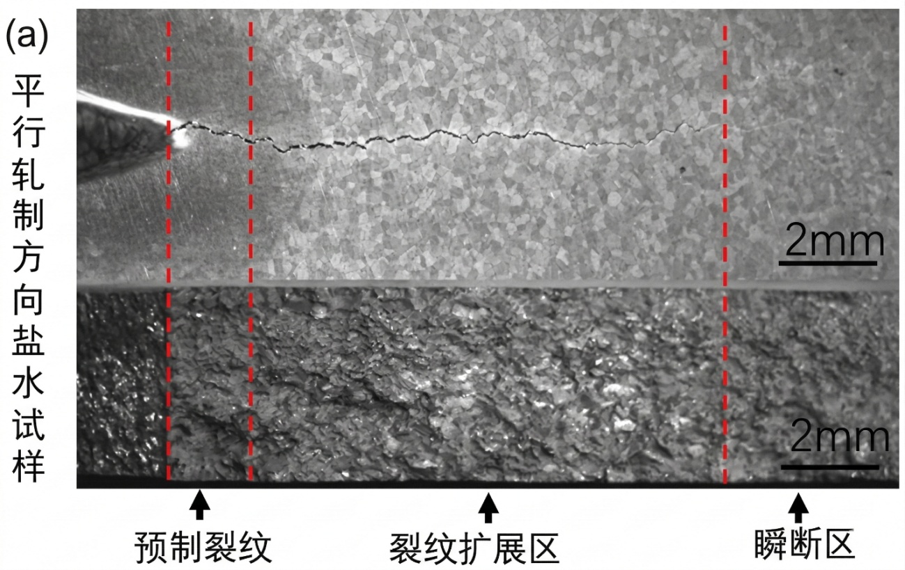 (4) 轧制取向通过调控晶粒形态、晶界类型及织构分布影响腐蚀疲劳性能:X向的长条状扁平晶、小角度晶界为主的织构,使裂纹扩展路径平直、偏转少,晶界微电池反应弱,氢原子富集程度低,阳极溶解与氢脆效应被显著抑制;Y向的等轴晶 + 短柱状晶、大角度晶界为主的结构,导致裂纹路径曲折、分叉多,晶界电化学电位差大,氢原子易在裂纹尖端富集,加剧阳极溶解与氢脆,使腐蚀疲劳损伤显著加速。