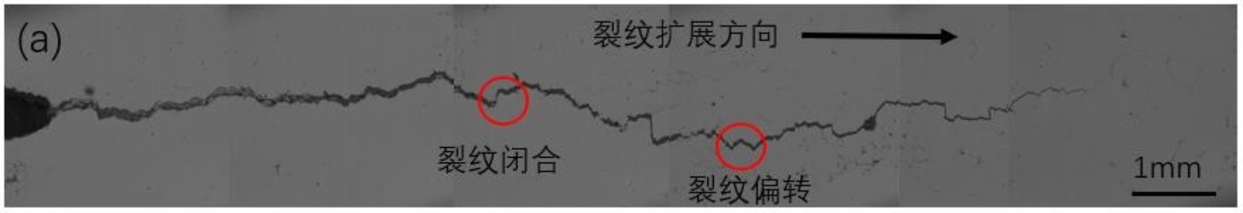 采用Zeiss-A1M型光学显微镜,对X向(平行于轧制方向)的试样在3.5 wt.% NaCl溶液中的疲劳裂纹扩展路径进行了显微观察(见图6)。在宏观尺度上,裂纹主要沿垂直于加载轴的方向扩展;在微观尺度上,局部区域表现出明显的裂纹偏折与闭合行为,且在裂纹尖端可见分叉特征。裂纹闭合现象主要受三个因素的耦合作用影响:裂尖前方循环塑性区的演变、裂纹面自身的几何粗糙度以及腐蚀产物沉积导致的“氧化物楔入”效应。此外,裂纹路径的频繁偏折改变了局部应力场的分布,增加了裂纹扩展的阻力,从而提升了裂纹扩展的临界应力水平。在恒定最大载荷条件下,这种由偏转诱发的“曲折路径效应”[14]能显著降低表观裂纹扩展速率,从而对疲劳寿命产生延长作用。此外,腐蚀介质与循环载荷的协同作用加剧了裂尖区域的局部溶解与氢脆等损伤过程,使其扩展机制相较于惰性环境下的纯机械疲劳更为复杂。
